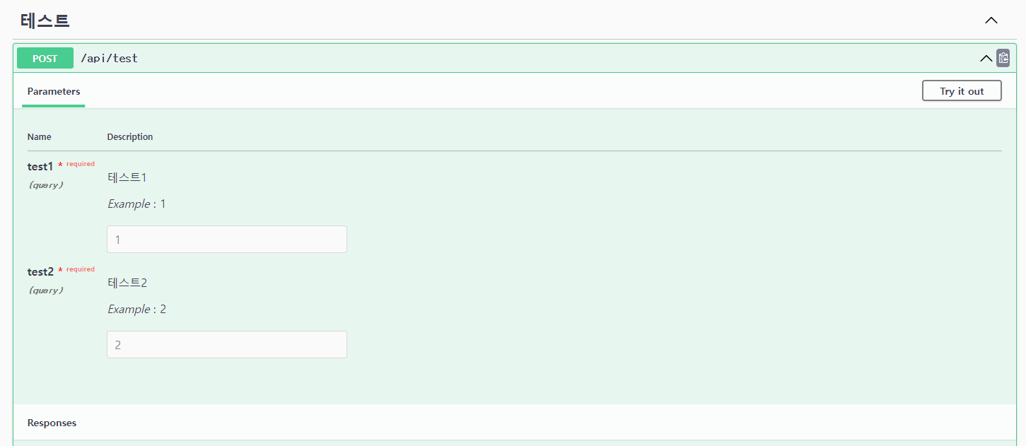 @Parameter(name = "test1", description = "테스트1", required = true, example = "1"),
